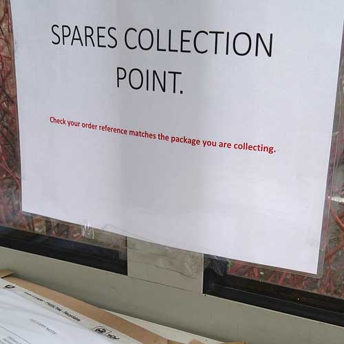 Click and Collect is self-service - you don't have to ring ahead to let us know you're coming to collect your order! Just turn up at our reception during our business hours and collect your items from our SPARES COLLECTION POINT